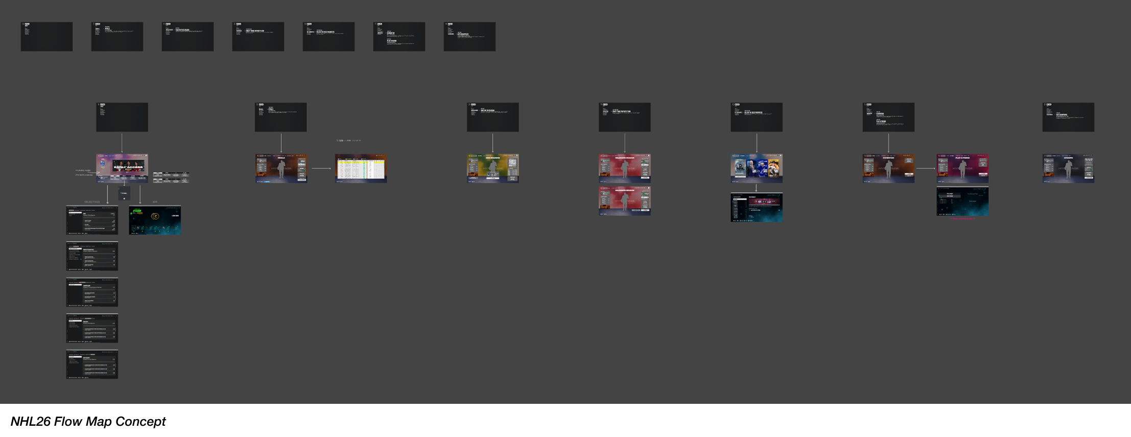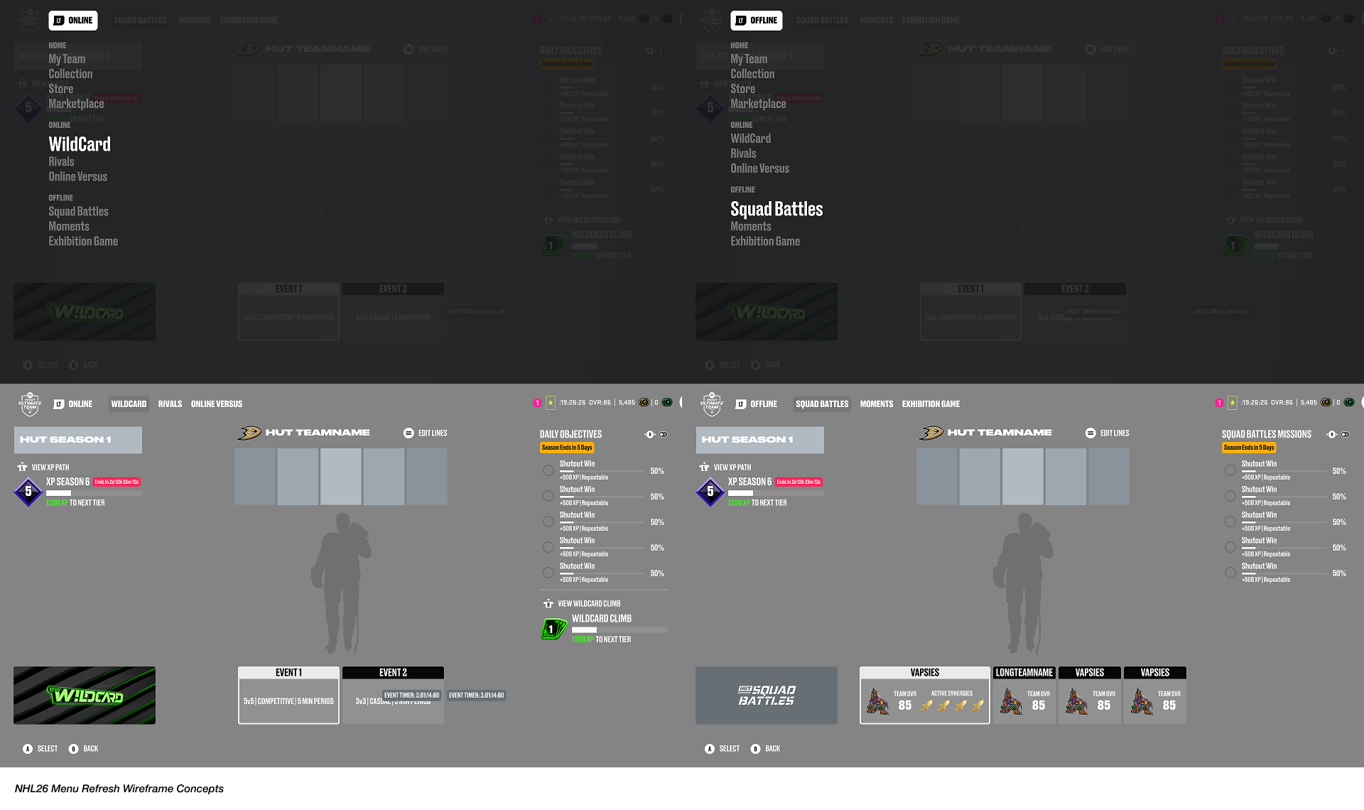 To explore solutions, I began by conducting competitive analysis across both EA titles and other leading sports games to understand modern navigation patterns and interaction best practices. From there, I produced a wide range of wireframe concepts that reimagined the structure of our play hubs and collaborated closely with fellow UX designers, Game Designers, and Producers to test variations, discuss usability, and refine what felt intuitive and efficient.