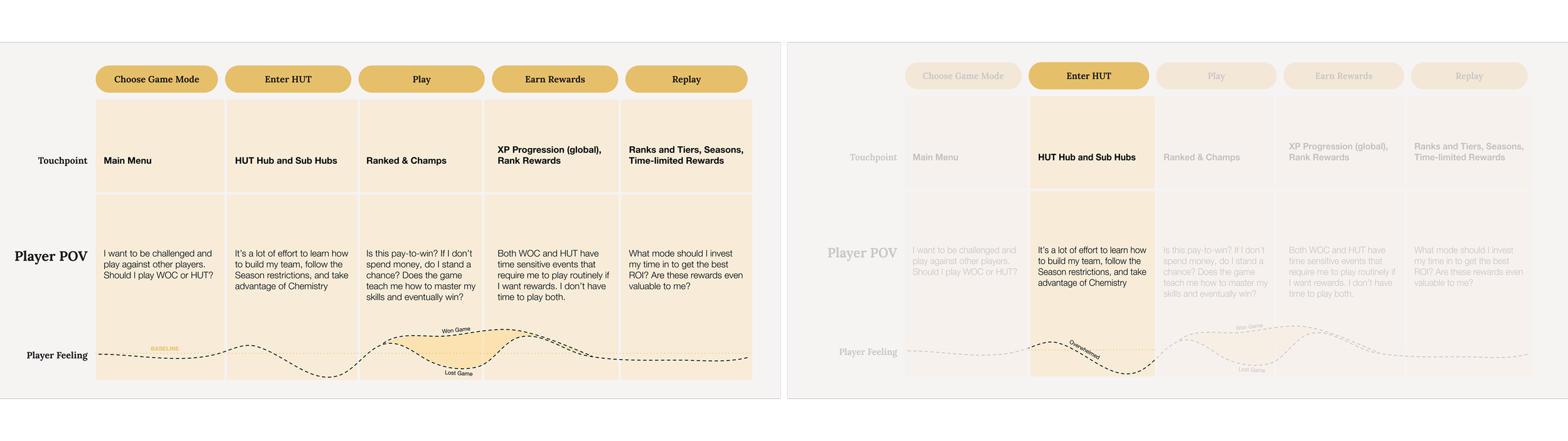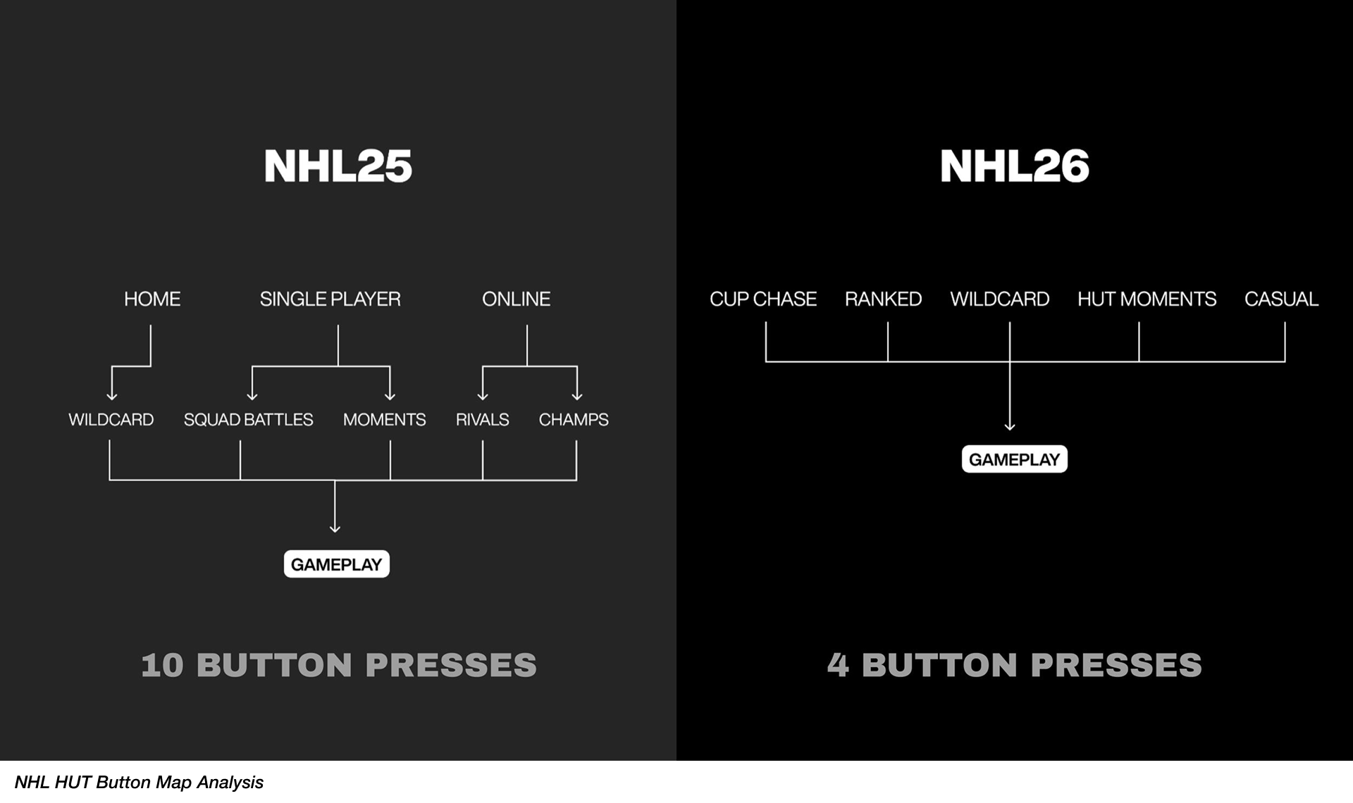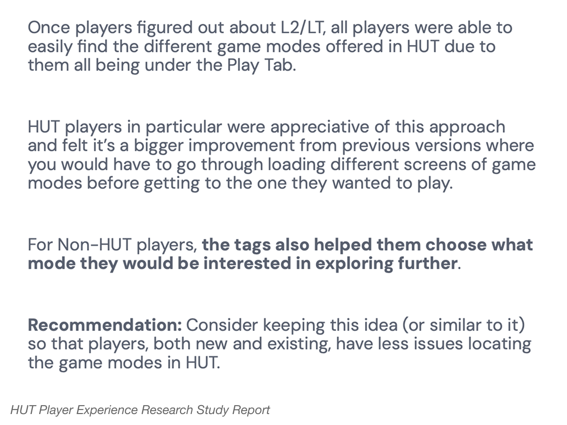 Through a detailed review of our menu systems across previous NHL titles, we identified two persistent interaction issues: the unclear organization of play modes, and the excessive button clicks required to reach gameplay. These friction points directly contributed to players feeling of a āchoreā or the ātediousā nature to HUT.