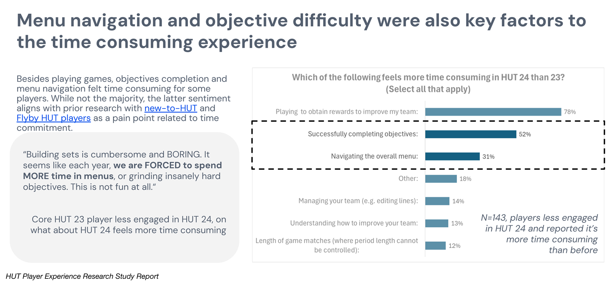 Overall navigation was described as tedious, with core tasks like moving between hubs, checking objectives, collecting rewards, and visiting the store feeling like a chore rather than part of the fun. These insights made it clear for our team on how we might approach the problem.
