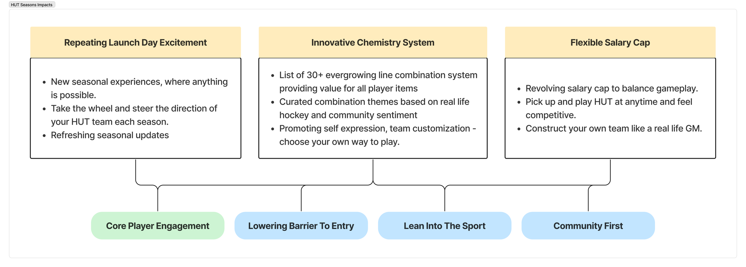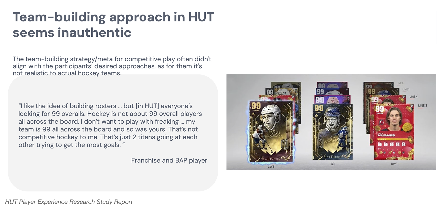 As part of a long-term initiative to shift the Hockey Ultimate Team (HUT) game mode into an evergreen model, my team supported a project focused on reshaping team-building dynamics to ship in NHL26. The goal of this project was to create new incentives for our users to stay engaged and competitive throughout the product’s life cycle while also ensuring player cards maintain their utility.