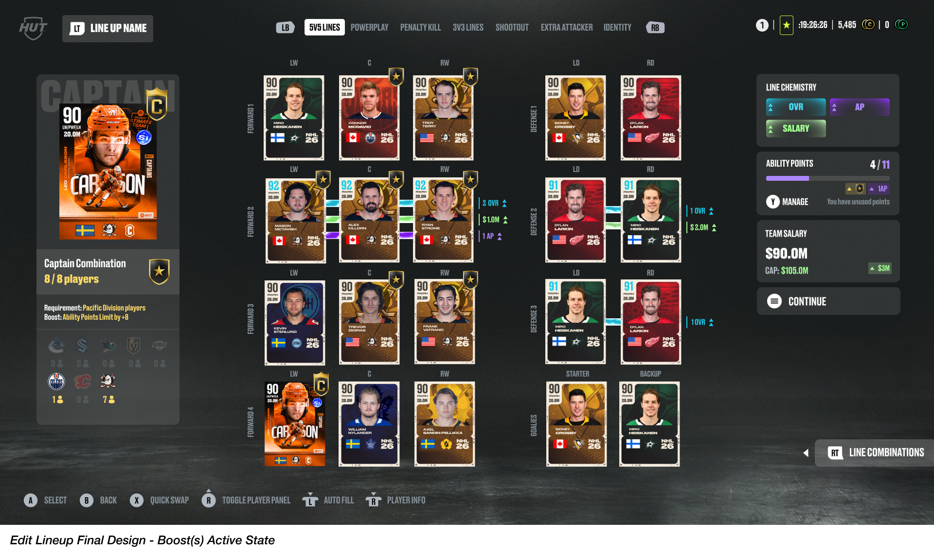 While the testing confirmed that players easily understood the Salary Cap dynamic and found the overall concept of the HUT Seasons feature appealing, a challenge remained with the Edit Lineup screen's information density. Many users found it difficult to navigate and fully understand the mechanics of the Captain Chemistry and Line Combination systems without feeling visually overwhelmed.
