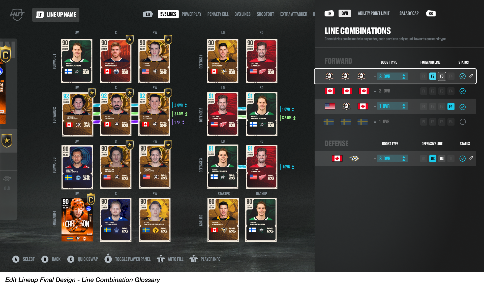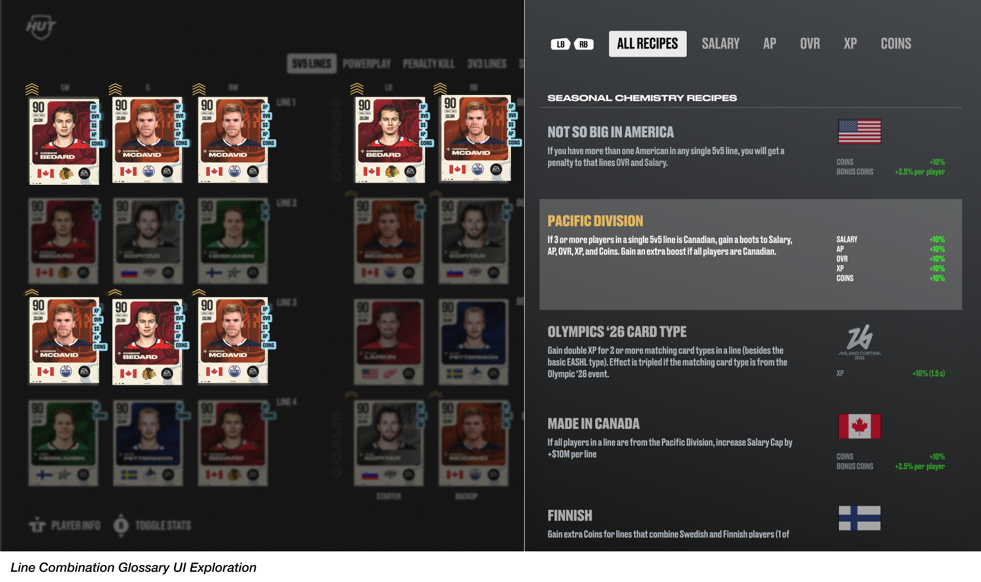 As we transitioned into high fidelity mockups, the focus was to manage the density of the screen. I worked closely with other visual designers and motion graphic experts on my team to explore visual systems with color and animations to provide users with more visual feedback when Captain Chemistry or Line Combinations boosts are achieved in the lineup. Another key design exploration involved developing a new flyout UI panel, accessible by a right-trigger button press, to surface a Line Combination glossary, ensuring that users are able focus better on strategizing for players in their lineup.
